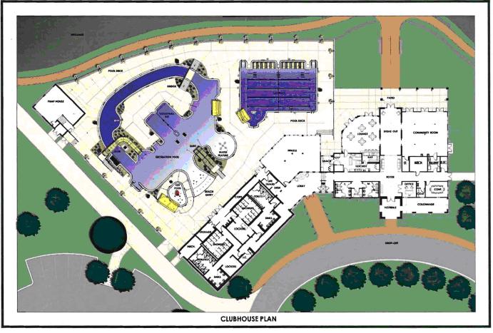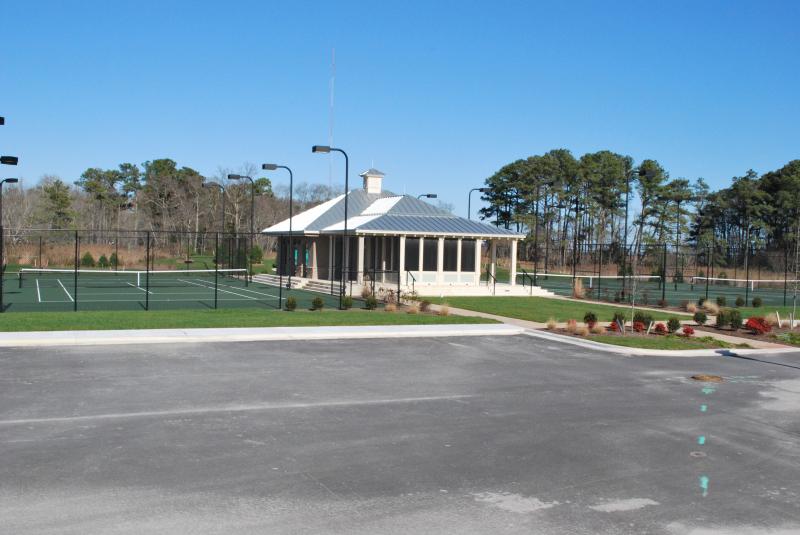 Tennis pavilion located adjacent to the clubhouse and pool and includes 4 lighted hard surface courts, bathrooms, a porch and seating area.